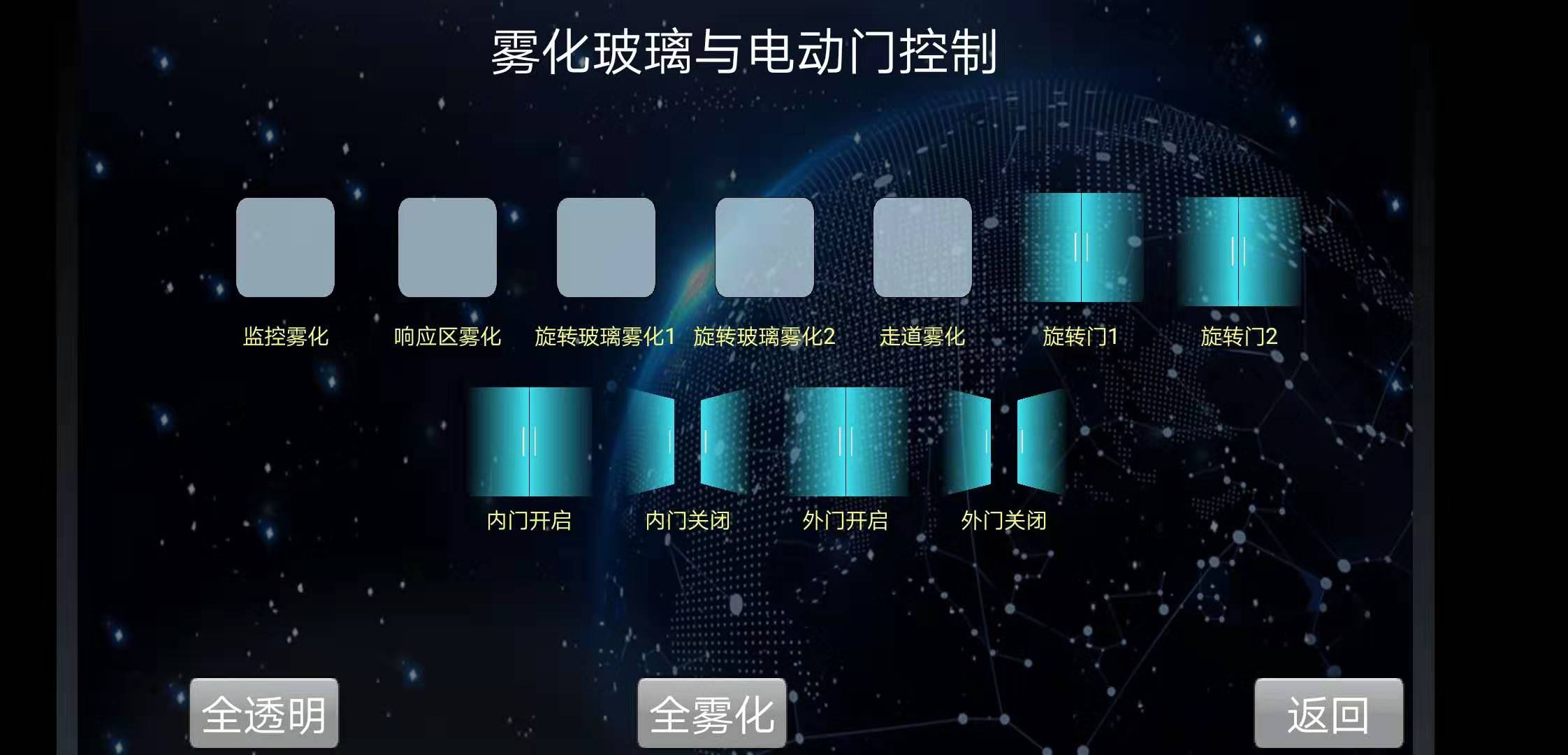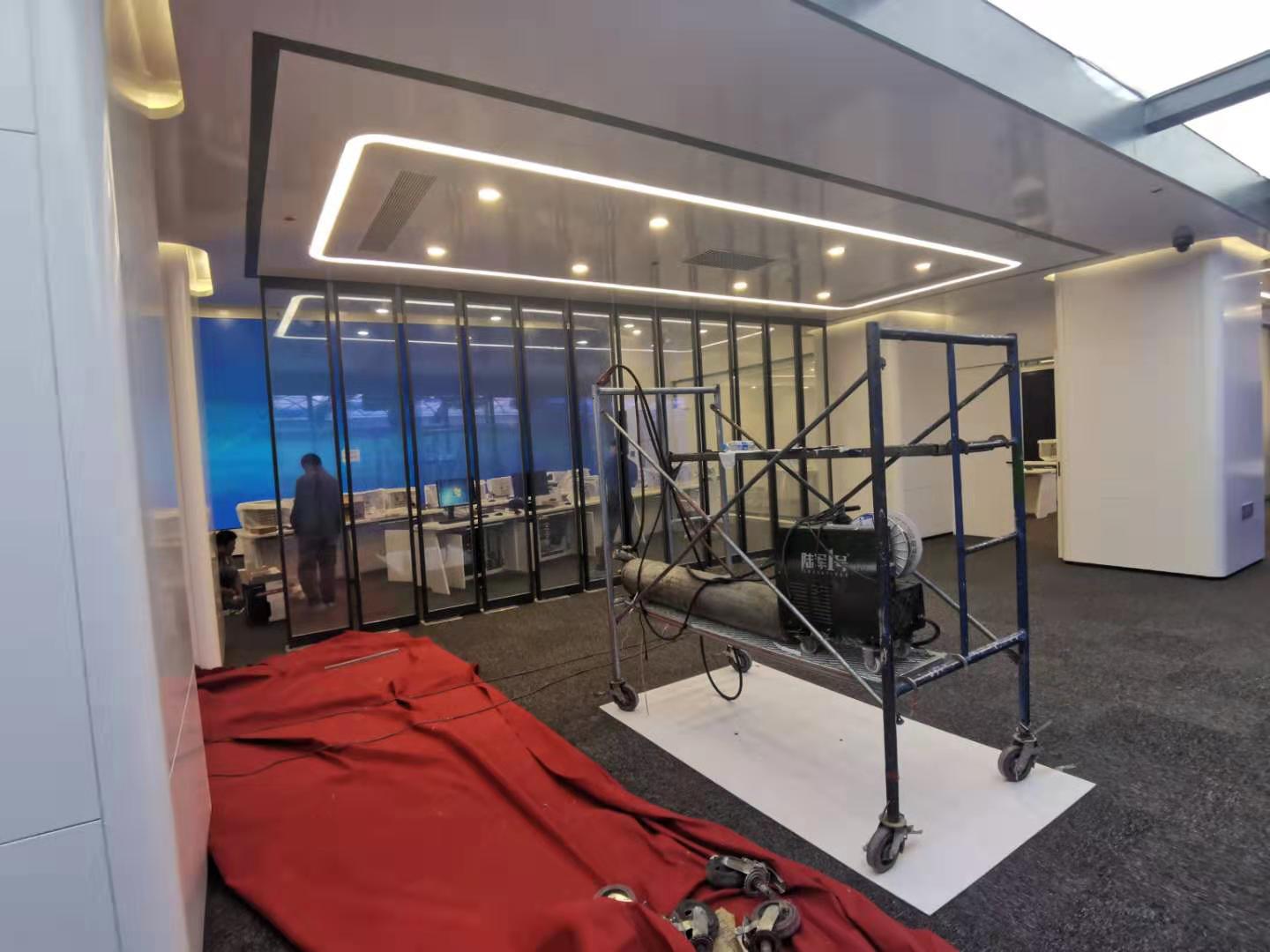 霧化玻璃與霧化玻璃門:調度中心有五組霧化玻璃,其中兩組為可旋轉霧化玻璃門。經(jīng)過技術對接以后,通過控制霧化玻璃的干接點信號,閉合則控制霧化玻璃門透明,斷開則控制霧化玻璃門霧化。旋轉門也同樣控制干接點信號,閉合則旋轉九十度,斷開則復原。