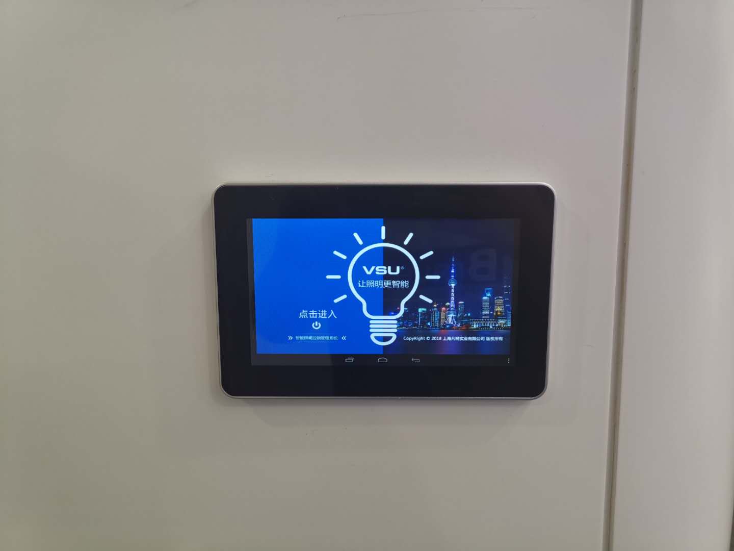 項目采用7寸觸摸屏對整個辦公區(qū)域進行集中控制:燈光控制;電動門的開啟與關閉;霧化玻璃的透明/霧化切換,霧化玻璃門的旋轉;空調的高中低三檔控制,以及各種場景化的控制效果。