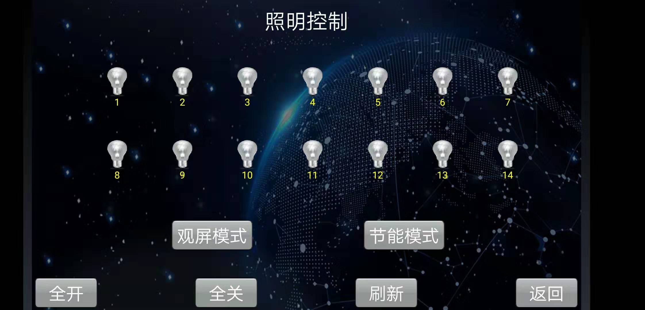 燈具:控制項目內的所有燈光照明,每個燈光回路可實現(xiàn)單獨控制,并設計了多種控制場景,如觀屏模式、節(jié)能模式、全開模式、全關模式等,使燈光控制變得更加智能、更加便捷。