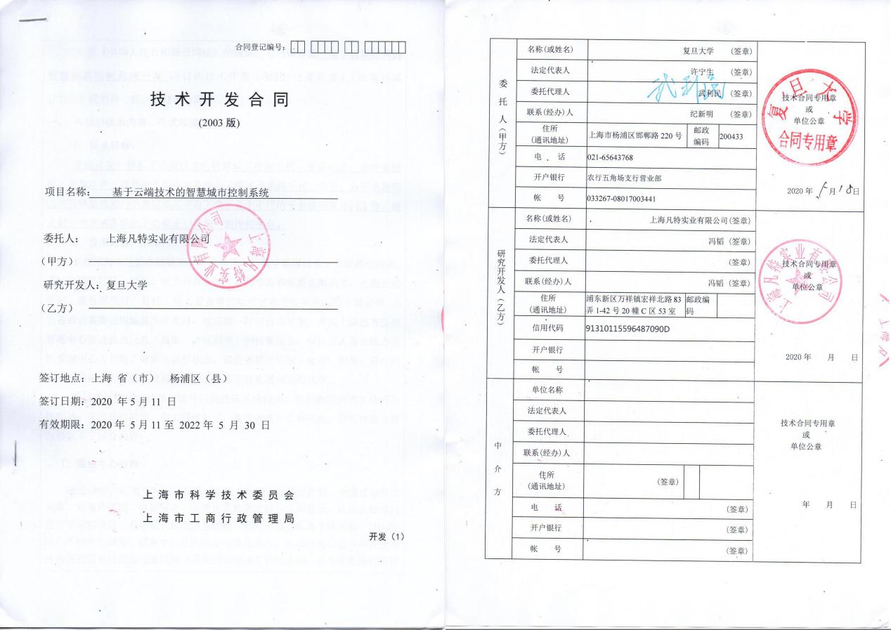 同年 5月11日,上海凡特實(shí)業(yè)有限公司正式與復(fù)旦大學(xué)簽訂《技術(shù)開發(fā)合同》——基于云端技術(shù)的智慧城市控制系統(tǒng)。項(xiàng)目將圍繞智慧城市開展科學(xué)研究、技術(shù)開發(fā)、成果轉(zhuǎn)化及文化交流等方面的合作。這次合作一面是能夠落實(shí)國家科教興國戰(zhàn)略,促進(jìn)科技創(chuàng)新,加快企業(yè)經(jīng)濟(jì)發(fā)展,充分利用高等院校的技術(shù)、人力等資源以及先進(jìn)成熟的技術(shù)成果。另一面,利用企業(yè)的生產(chǎn)條件,提高教學(xué)的科研能力,將科研成果盡快地轉(zhuǎn)化為生產(chǎn)力,不斷提升企業(yè)的技術(shù)和管理水平,雙方發(fā)展各自優(yōu)勢。上海凡特通過多種形式開展全面合作,共同推進(jìn)公司與復(fù)旦學(xué)校的全面技術(shù)合作,形成專業(yè)、產(chǎn)業(yè)相互促進(jìn)、共同發(fā)展,努力實(shí)現(xiàn)“校企合作、產(chǎn)學(xué)雙贏”!