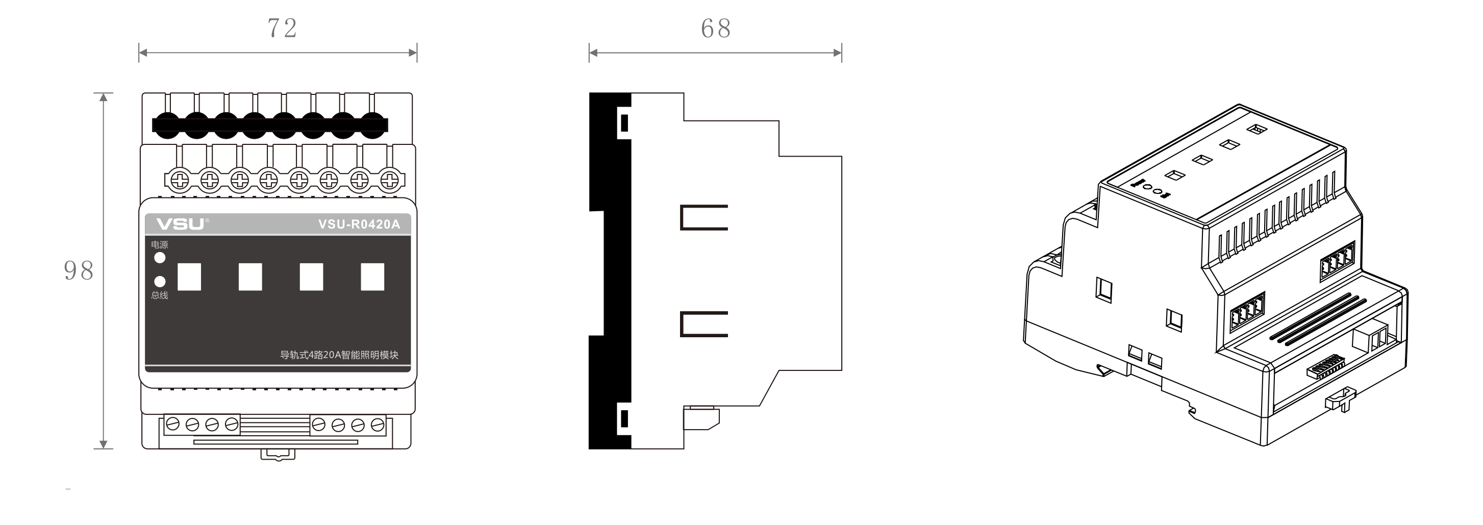 1,標(biāo)準(zhǔn)導(dǎo)軌式安裝占4個(gè)模數(shù)位;