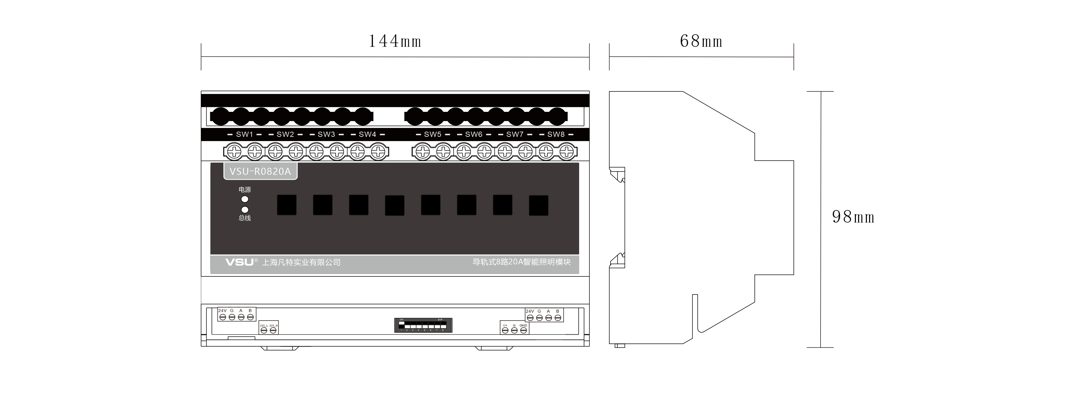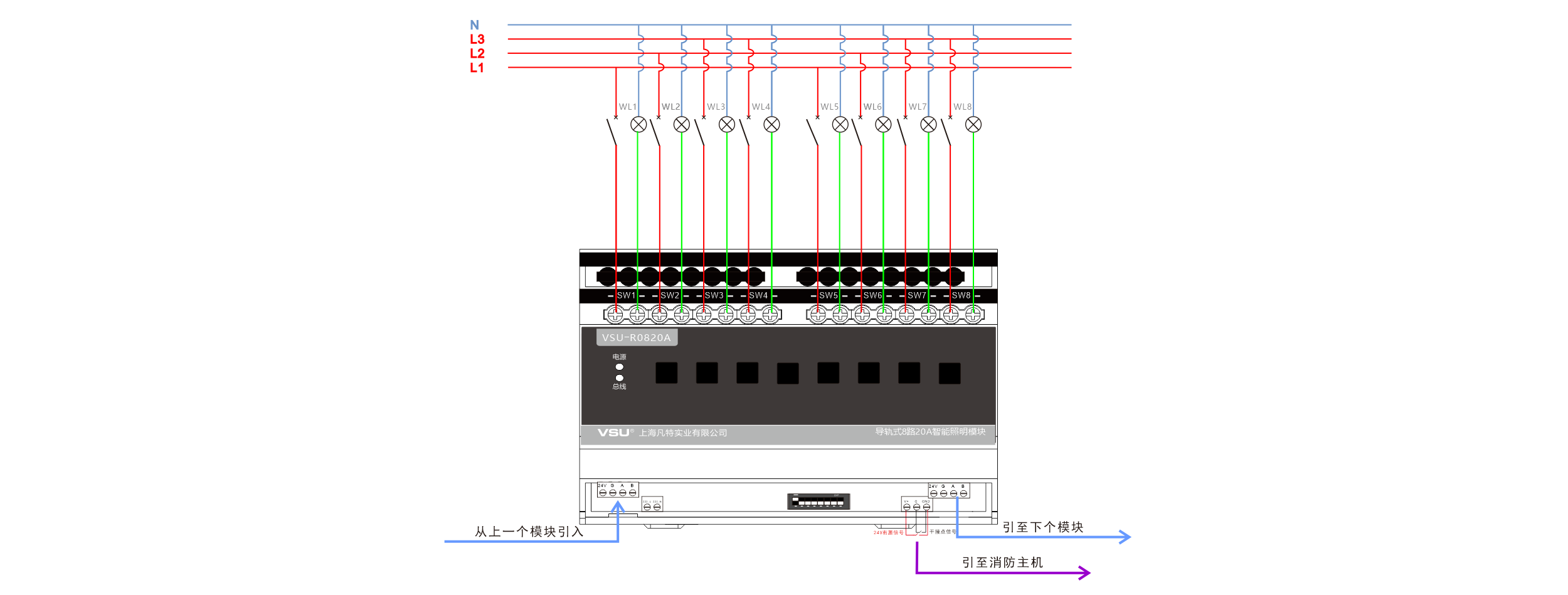 本產(chǎn)品為導軌式安裝,含8路智能繼電器,每回路可獨立控制4400W燈具的開關(guān),帶應(yīng)急按鍵,LED燈時時指示各個回路開關(guān)狀態(tài),可設(shè)置為互鎖控制4組窗簾開合;