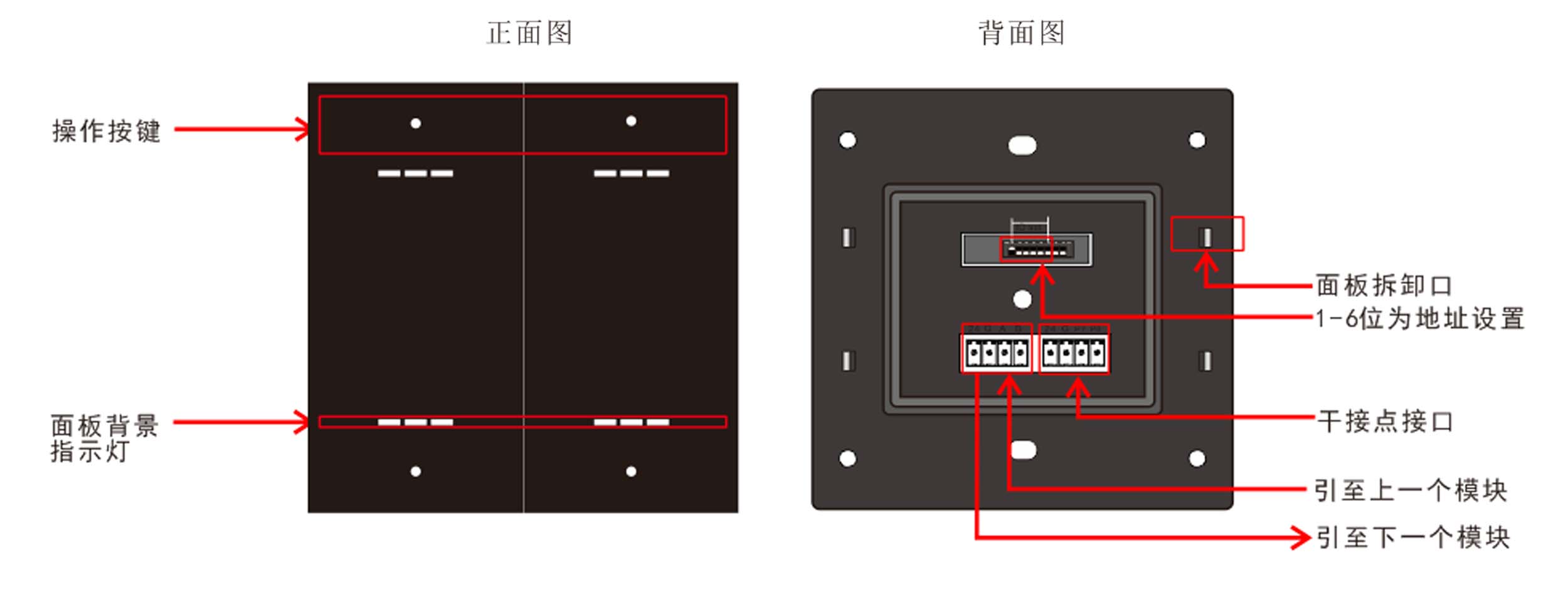 標準86底盒安裝,支持無縫聯(lián)接,提供4鍵,每個按鍵帶1路LED指示燈,復位式輕觸開關,結構成熟,性能穩(wěn)定,標準工藝,采用塑料材質(顏色可選灰色、黑色和香檳金);自帶感應式背光燈;提供兩路IO輸入可外接傳感器。